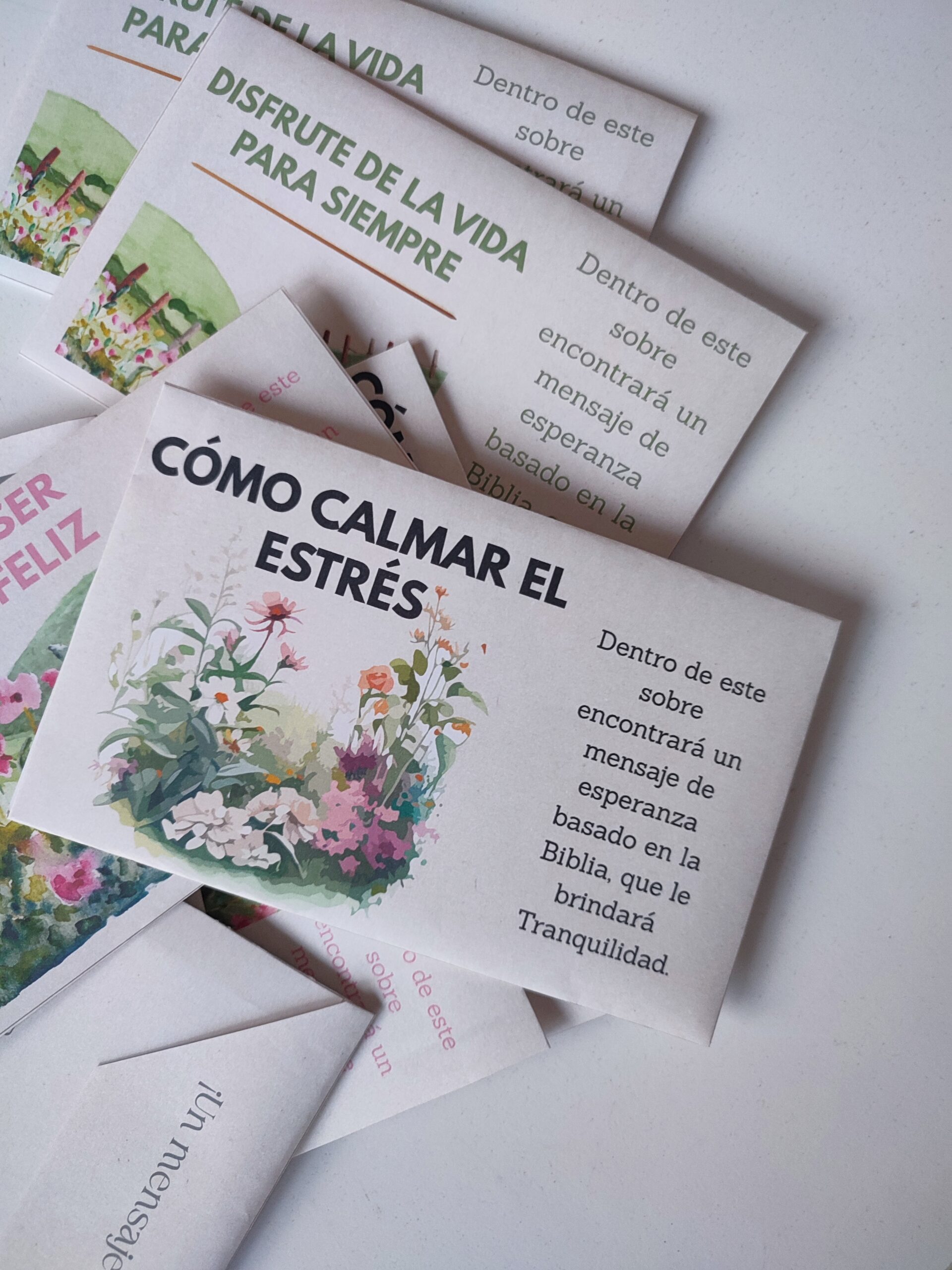El archivo contiene 4 páginas con 4 diseños de sobres con temas variados.
